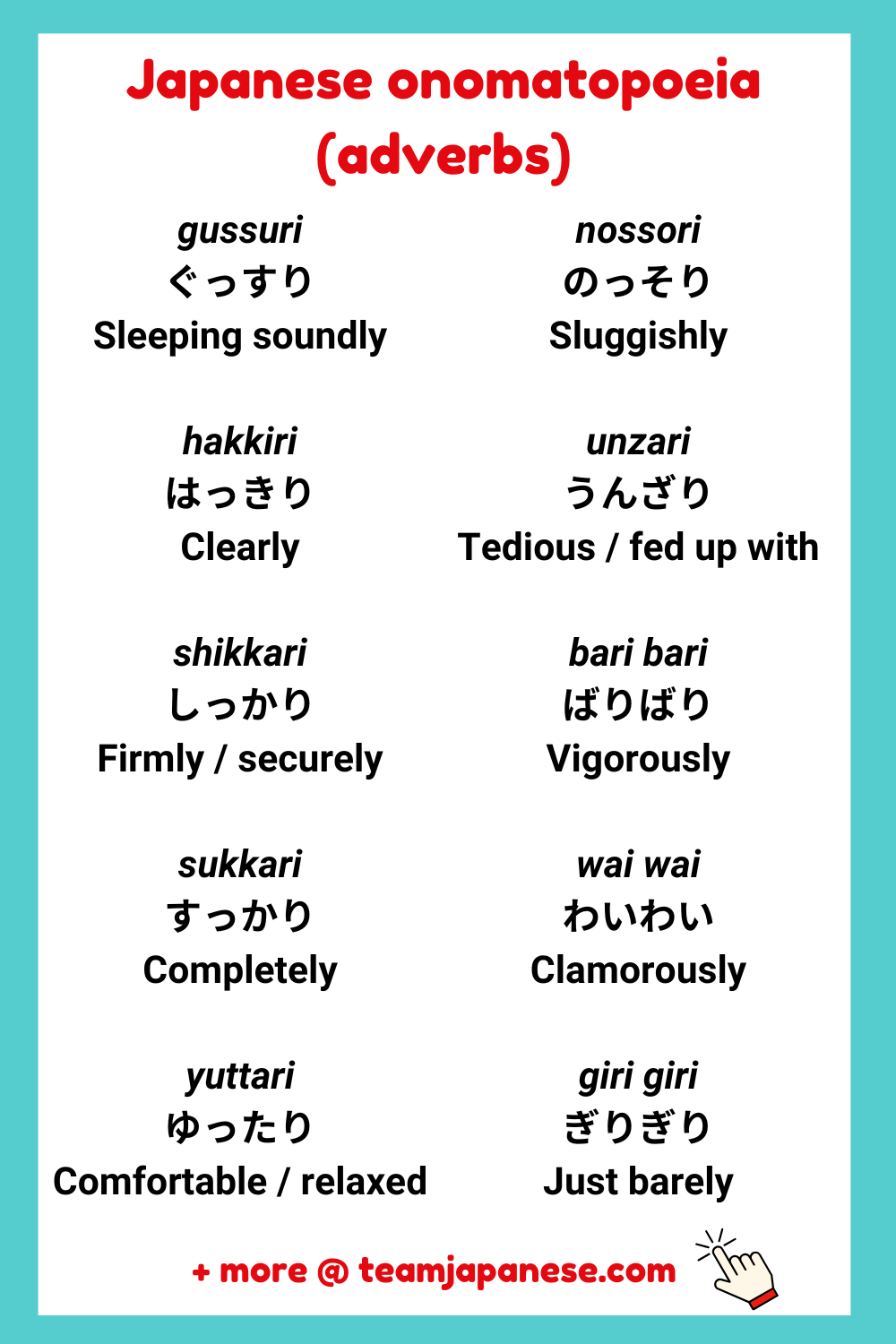 japanese onomatopoeia adverbs Team Japanese uses affiliate links. That means that if you purchase something through a link on this site, we may earn a commission (at no extra cost to you).